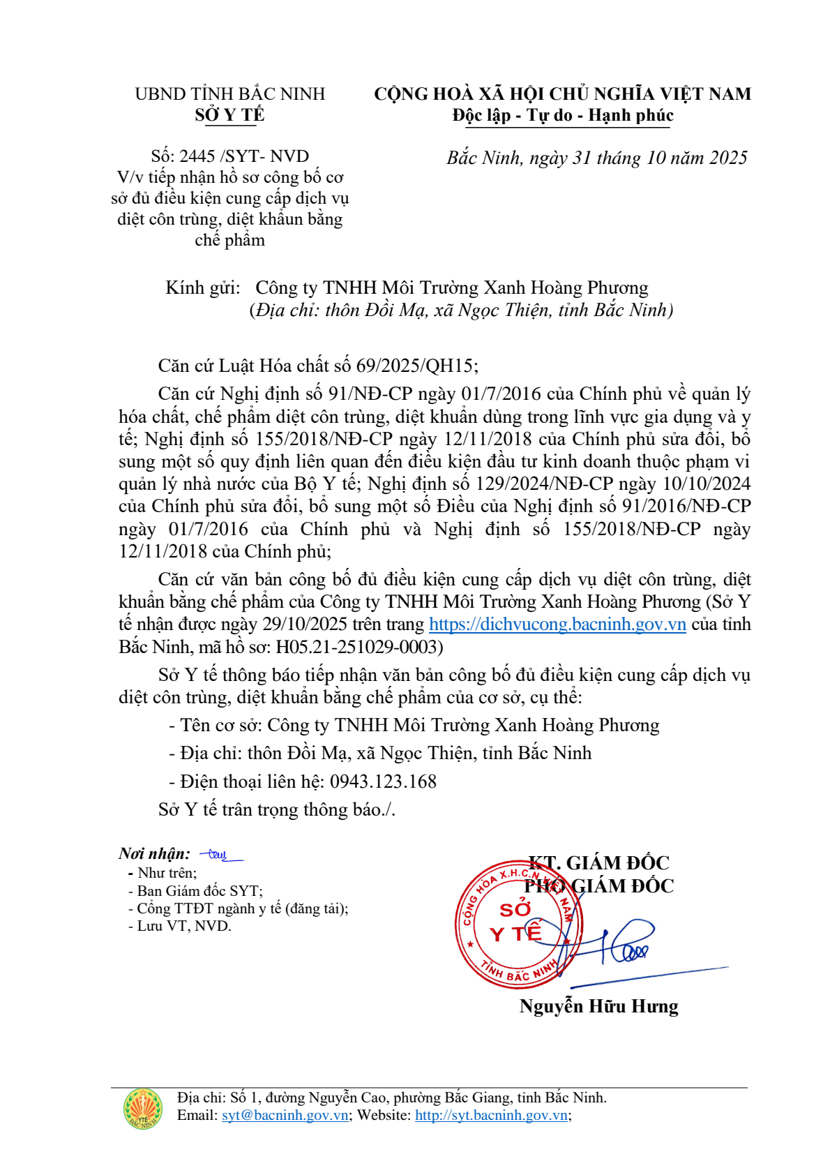 Dịch vụ kiểm soát côn trùng & động vật gây hại của chúng tôi đã được công bố trên Cổng thông tin của Sở Y Tế Tỉnh Bắc Ninh✅